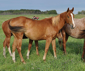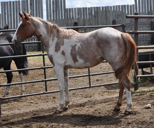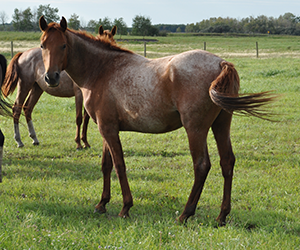 This Stallion should turn strawberry roan. His dam produces fancy foals every year and here is another one. Nice small head. Would make a great pleasure or rope horse.